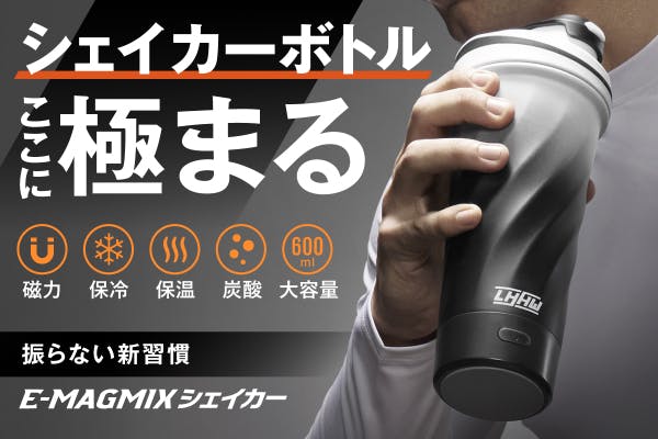 そんな“マルチボトル問題”を一気に解決してくれるのが、自動攪拌できるサーモタンブラー「E-MAGMIX」。充電もワイヤレスでOKという次世代シェイカーです。プロテインはボタンひとつでダマなしで完成。コーヒーやスープも温度キープしやすく、炭酸飲料もOKという優れモノ。