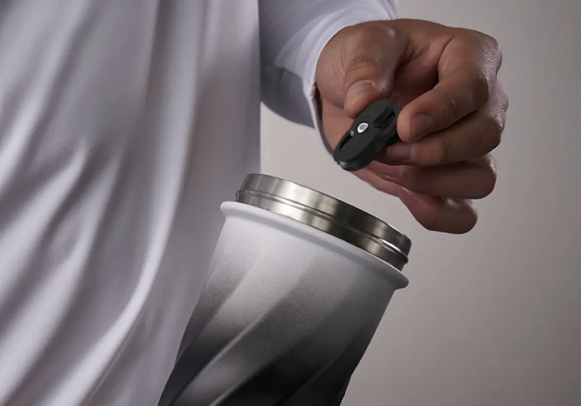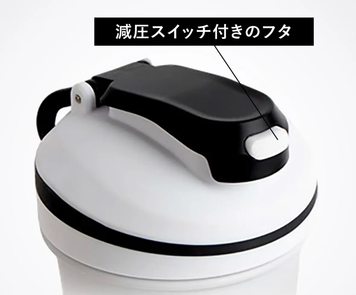 飲み口にはしっかりとした蓋があり、さらに減圧スイッチも搭載。炭酸プロテインなどの泡立ちやすい飲料も漏れを防いで快適に楽しめるとのこと。