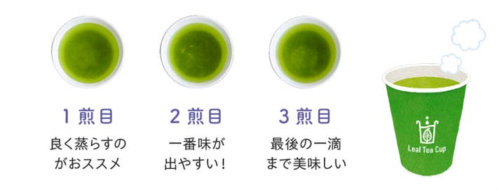 リーフティーカップは、急須のようにお湯を注ぎ足して2回おかわりしてもおいしいお茶。1煎目の香り、2煎目の旨み、3煎目までしっかり楽しめます。私自身、一日中お湯を注ぎ足して、気がつけば7〜8杯おかわりしていることもあります(笑)。
