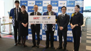 国際コーヒーの日に記念イベントを開催/UCCコーヒープロフェッショナル×スカイマーク 神戸空港で約500人に記念品を配布 荒牧専務執行役員(中央右)と高木取締役本部長(中央左) UCCコーヒープロフェッショナルとスカイマークは、10月1日の「国際コーヒーの日」に合わせ、神戸空港で記念イベントを実施。 当日は、神戸発祥のUCCグループと、神戸空港を「西の拠点」とするスカイマークが連携。対象便の搭乗客約500人に、UCCが提供するワンドリップコーヒーセットを配布した。記念セットには、UCCが世界で初めて開発した大型水素焙煎機を使用したワンドリップコーヒーも含まれ、空港利用者に広くP... 2025.10.04