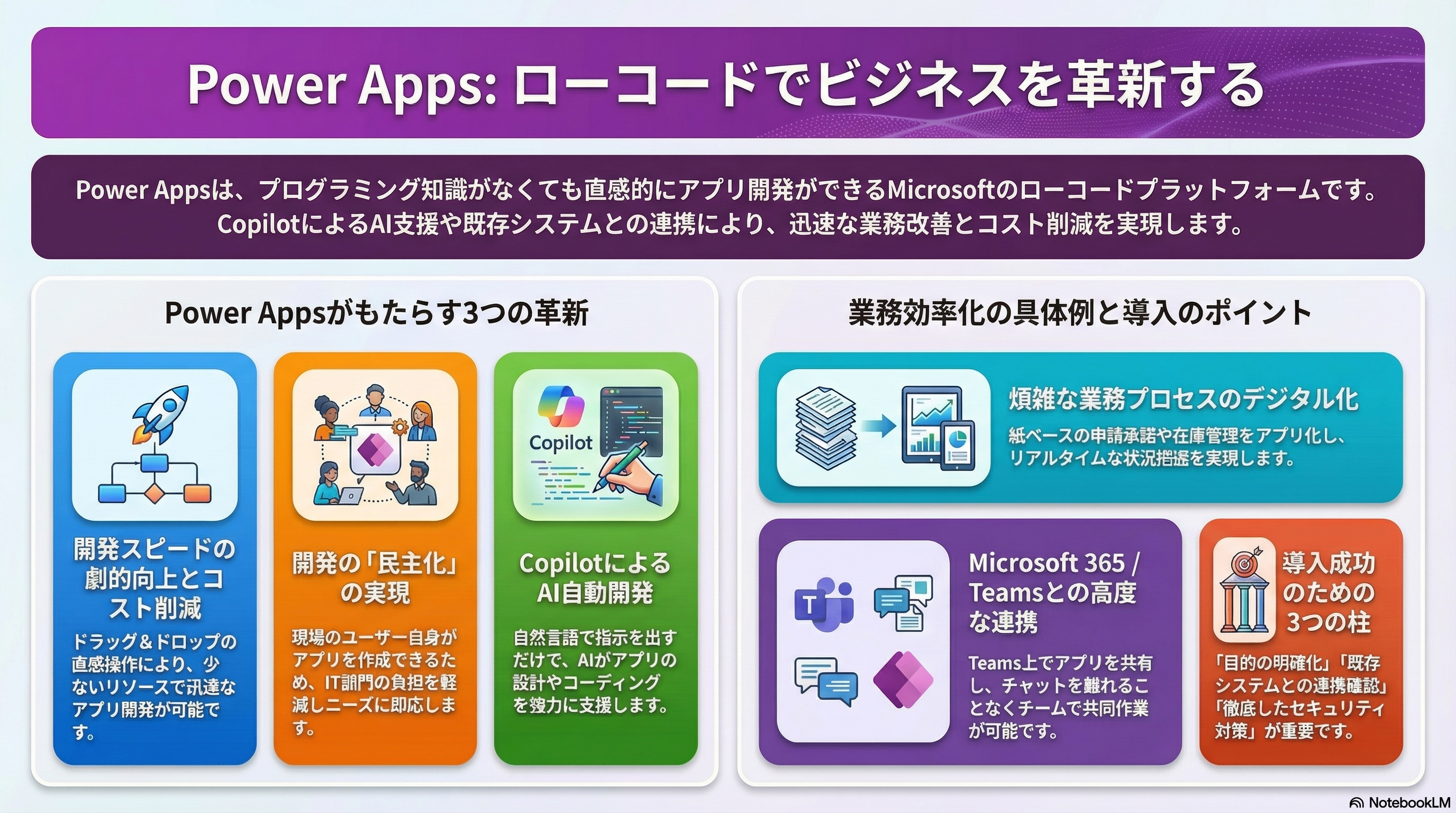 PowerAppsは、ローコードでビジネスアプリケーションを開発できる強力なツールです。業務効率化、データ分析、コミュニケーションの促進など、様々なメリットをもたらします。PowerAppsを導入する際は、目的を明確にし、計画を立て、セキュリティ対策をしっかりと行うことが重要です。PowerAppsを活用して、ビジネスの可能性を広げましょう。PowerAppsは、ビジネスの現場で働く人々にとって、非常に強力な武器となります。プログラミングの知識がなくても、アイデアを形にすることができ、業務の効率化や改善に貢献することができます。PowerAppsを使いこなすことで、ビジネスの可能性を大きく広げることができます。ぜひ、PowerAppsを導入して、ビジネスの課題解決に役立ててください。そして、より創造的な仕事に集中できる環境を手に入れましょう。