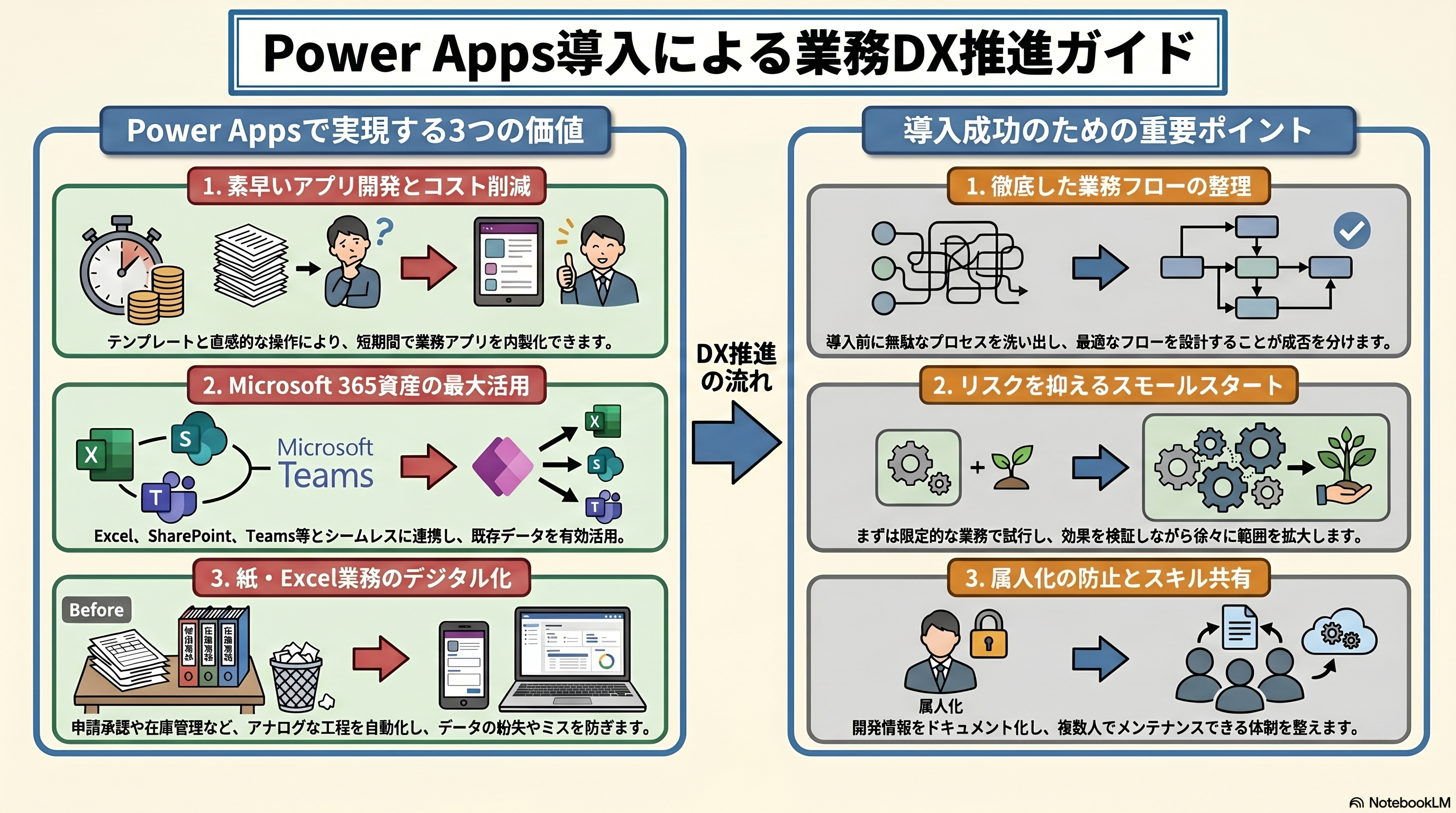 PowerAppsは、企業の業務効率化に大きく貢献する可能性を秘めた強力なツールです。導入に向いている業務を慎重に見極め、導入時の注意点をしっかりと守りながら導入を進めることで、期待以上の効果を得られるでしょう。ぜひ、PowerAppsを積極的に活用して、企業のデジタルトランスフォーメーションを加速させてください。PowerAppsは、単なるアプリケーション開発ツールではなく、企業のビジネスプロセスを革新するためのプラットフォームです。PowerAppsを活用することで、従業員の創造性を刺激し、新たなビジネス価値を創出することができます。PowerAppsの導入は、企業の競争力を高め、持続的な成長を可能にするための重要な投資となります。PowerAppsの可能性を信じ、積極的にチャレンジすることで、未来のビジネスを切り開いてください。