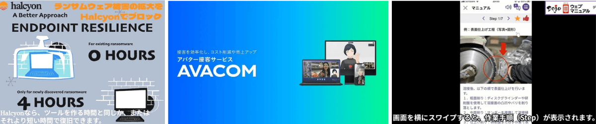 注目の出展製品として、高千穂交易株式会社の「halcyon」、株式会社テンダの「Dojoウェブマニュアル」、AVITA株式会社の「AVACOM」などが出展します。